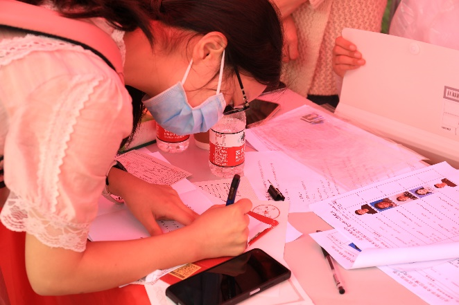 2021年9月5号上午五点半,我院迎新工作在日出之前便开启了。六点十分,第一位同学抵达迎新点。工作人员进行扫码登记、核验材料、信息确认、拍照留念、发放材料…热情的微笑,耐心的讲解,细致的引导——这就是迎新工作的关键词。迎新工作组成员认真地为新生同学办理每项手续,并为他们提供咨询,解答问题。上午天有点阴,随后微微细雨断断续续地下起来,但却丝毫不减迎新人员的热情。本次迎新工作组中有一支特殊的志愿者队伍,他们是由我院预备党员和入党积极分子组成的。志愿者随时待命,为新同学伸出援手,帮助搬运行李、作向导。