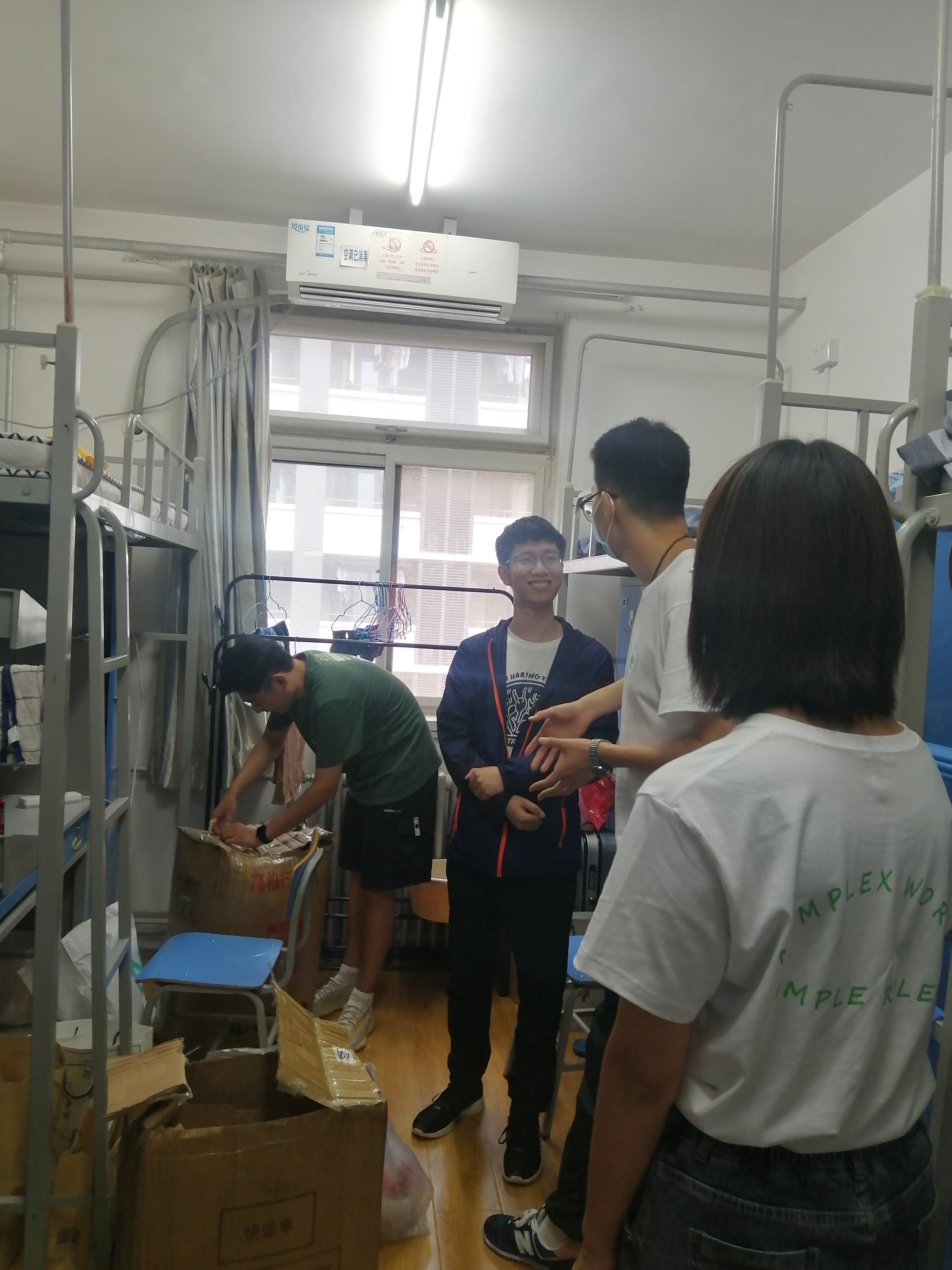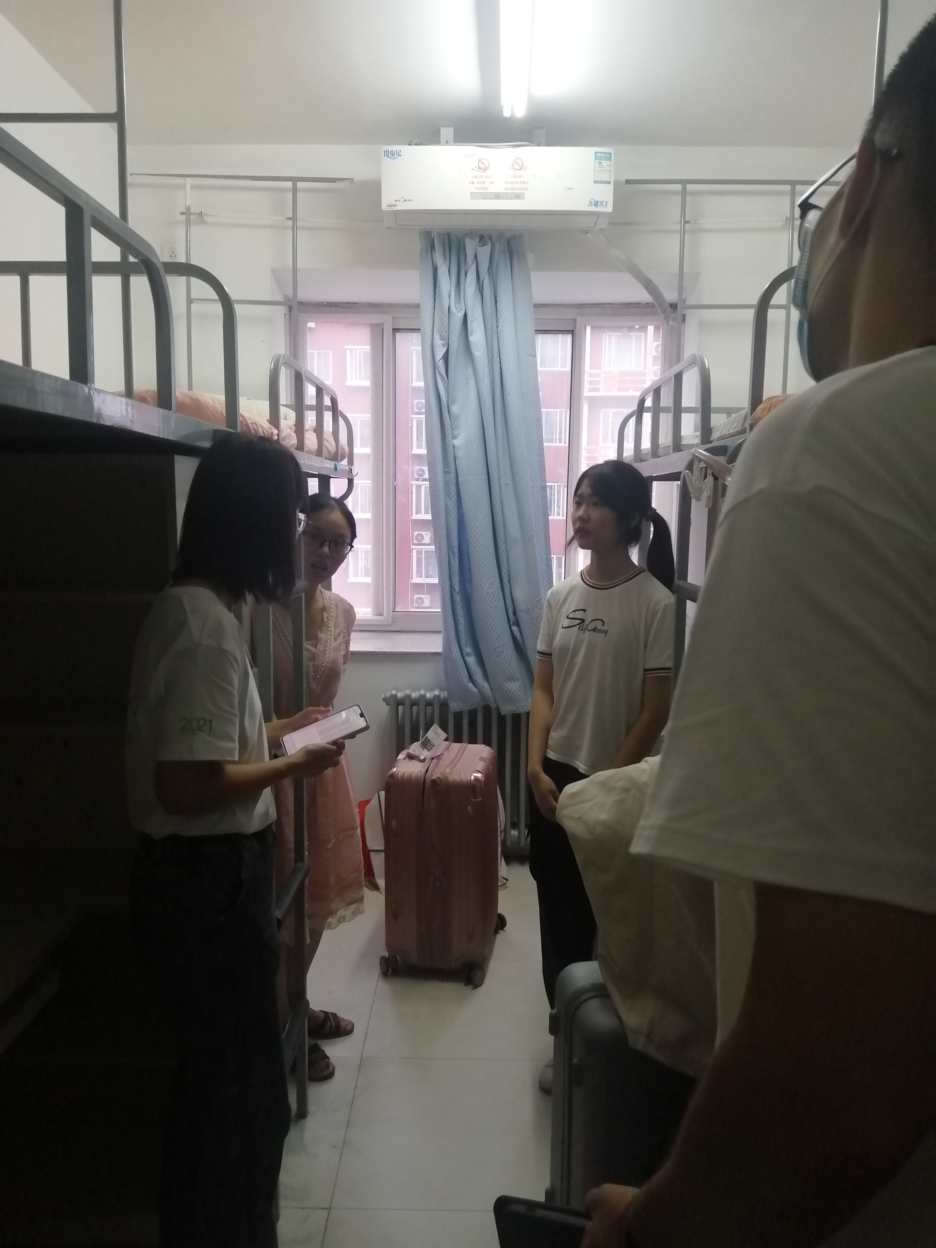 2021年9月5日下午17:00,紧张而忙碌的迎新工作收尾。下午17:30,团委书记王娟、研会主席陈娜和团委副书记任峻泽一起走访本部校区我院新生宿舍。他们带去了学院对新生同学们的温暖关怀。他们依次前往学十六、学十五、学四、学三走访我院新生宿舍。